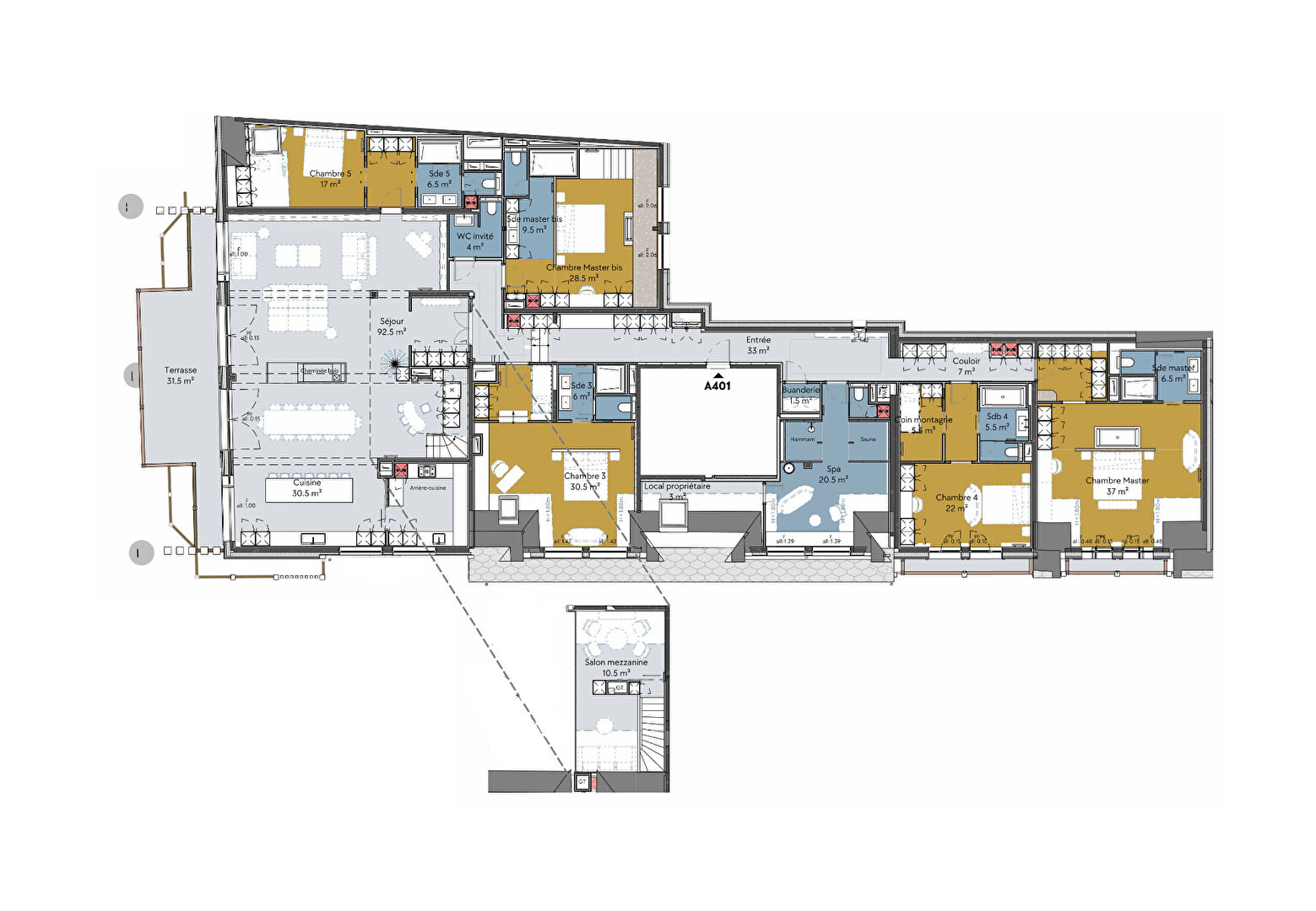 Dans une résidence de prestige neuve et intimiste, découvrez ce penthouse de 377 m² + 36 m² < 1,80 m. Seul au dernier étage de l'immeuble, il propose un vaste séjour cathédrale de plus de 90 m² avec 2 cheminées et offre une vue imprenable sur le panorama unique du massif de Bellevarde et sa légendaire Face Olympique. Ses six chambres (dont deux chambres de maître et une chambre familiale) permettent d'accueillir jusqu'à 12 personnes dans un confort absolu, l'une d'elle intégrant même une cheminée privative ! Un espace bien être avec sauna et hammam vous attend après ski . Un lieu unique où s'écriront, assurément, des moments inoubliables en famille ou entre amis. Livraison Décembre 2027. Copropriété de 11 lots (Pas de procédure en cours).